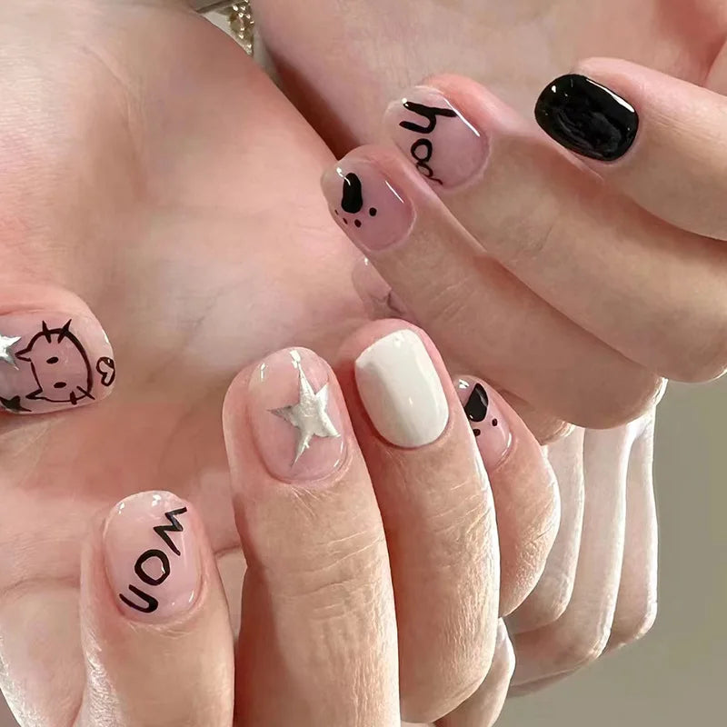 24Pcs Short Square Head Kawaii Nail Tips Colorful Stars Design Press on Nails with Rhinestone French Wearable Fake Nails