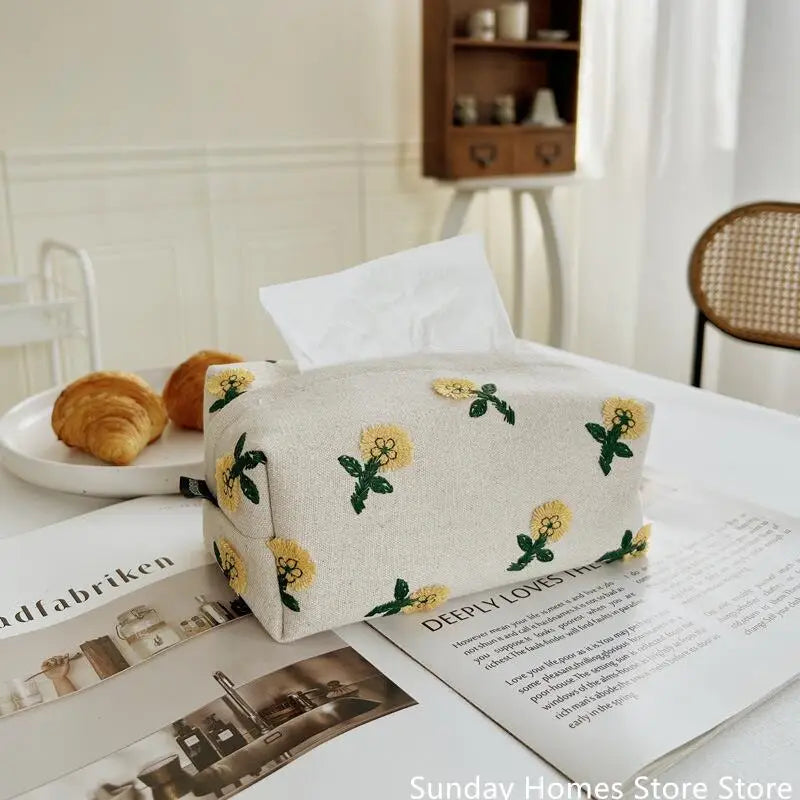 Hooux Green Forest Plant Cotton Linen Fabric Embroidery Paper Box Napkins Paper Holder Tissue Box Bedroom Tabletop Ornament Car Napki