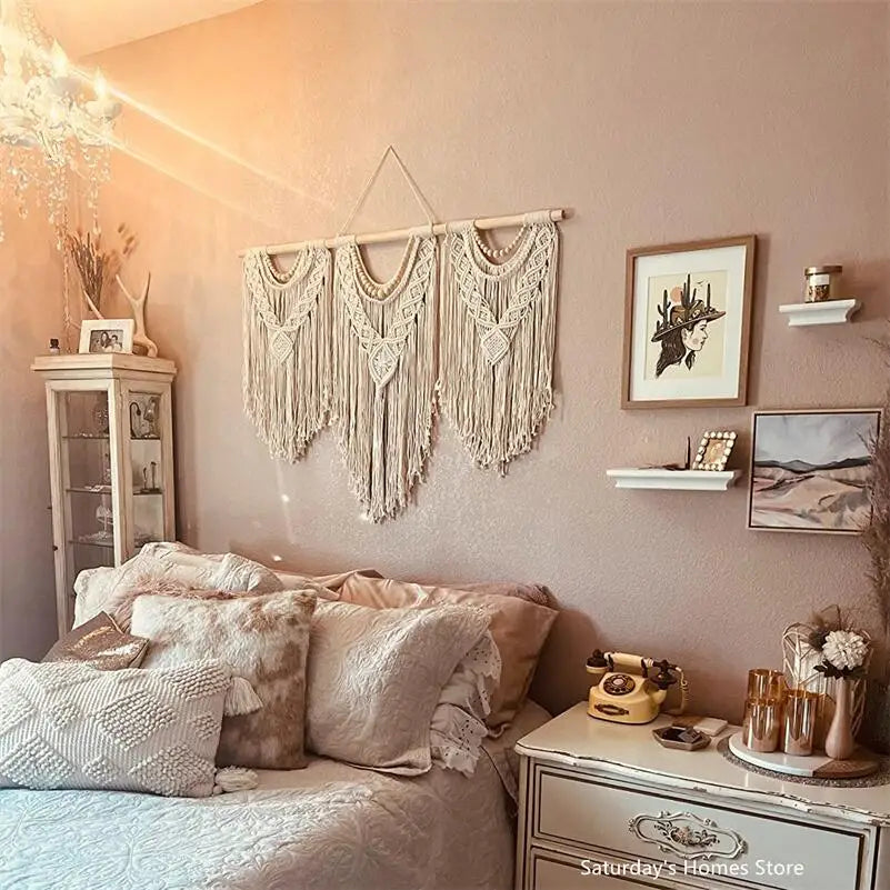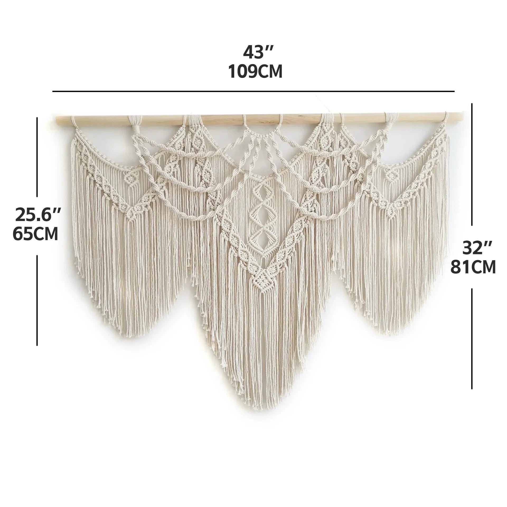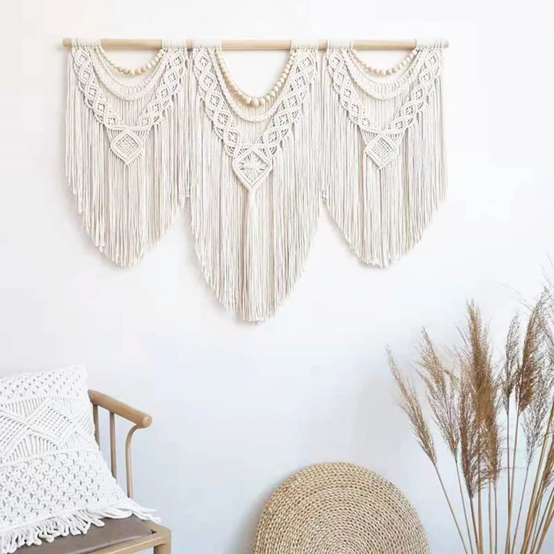 Hooux Large Macrame Tapestry Hand Made Cotton Rope Tassel Pendant Wall Hanging Tapestry with Wooden Stick Hand-Woven Bohemia Tassel