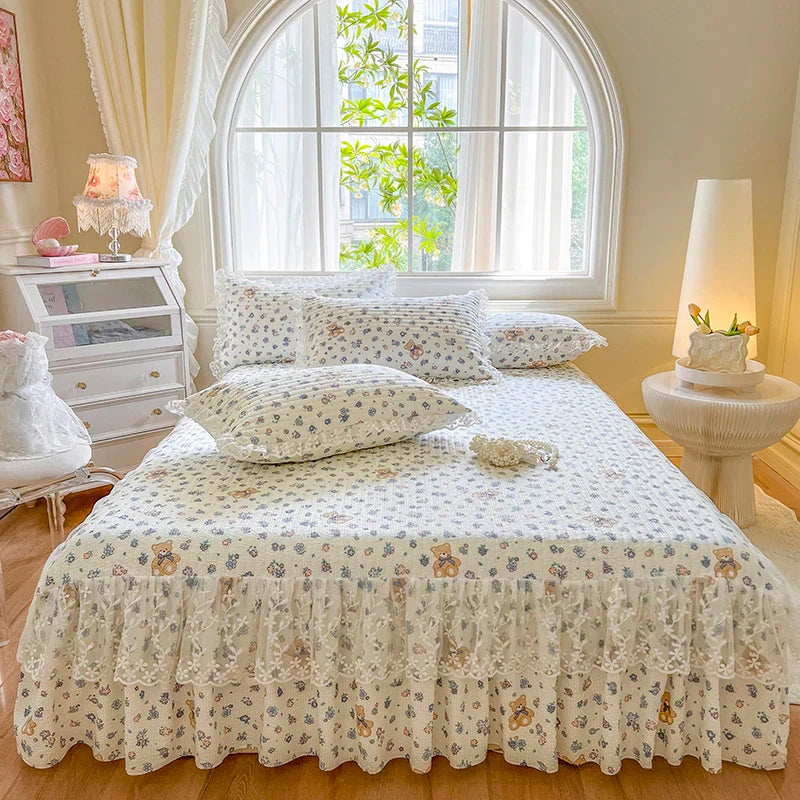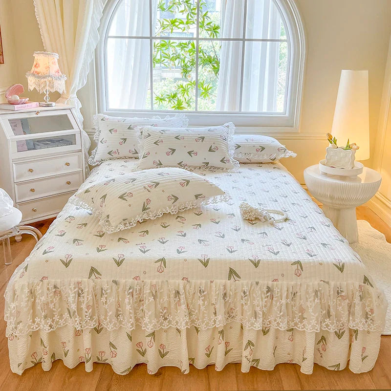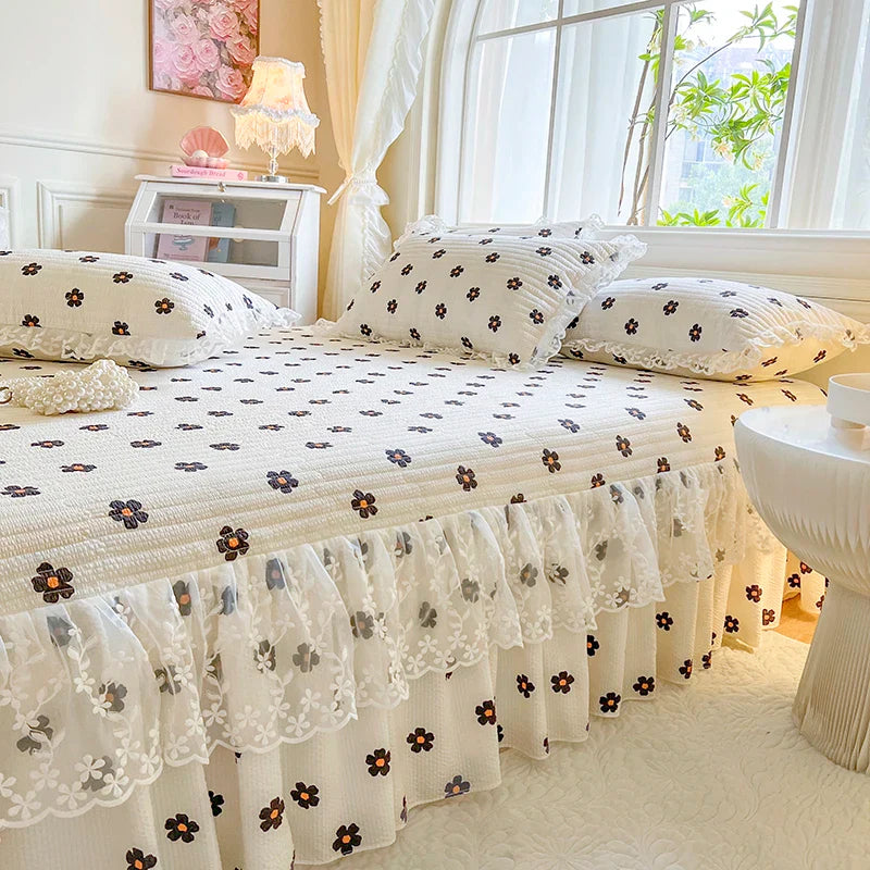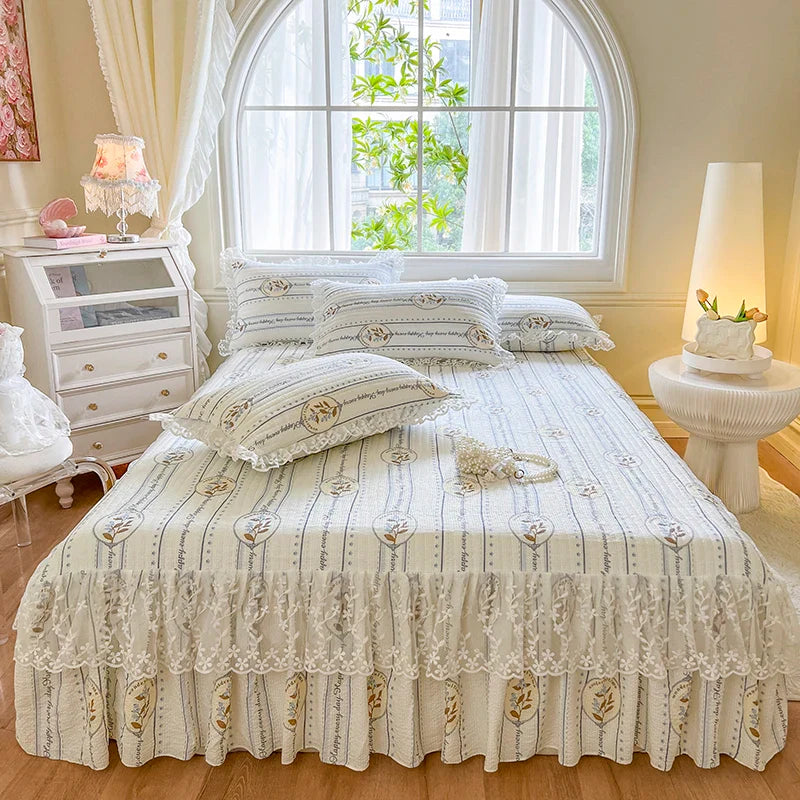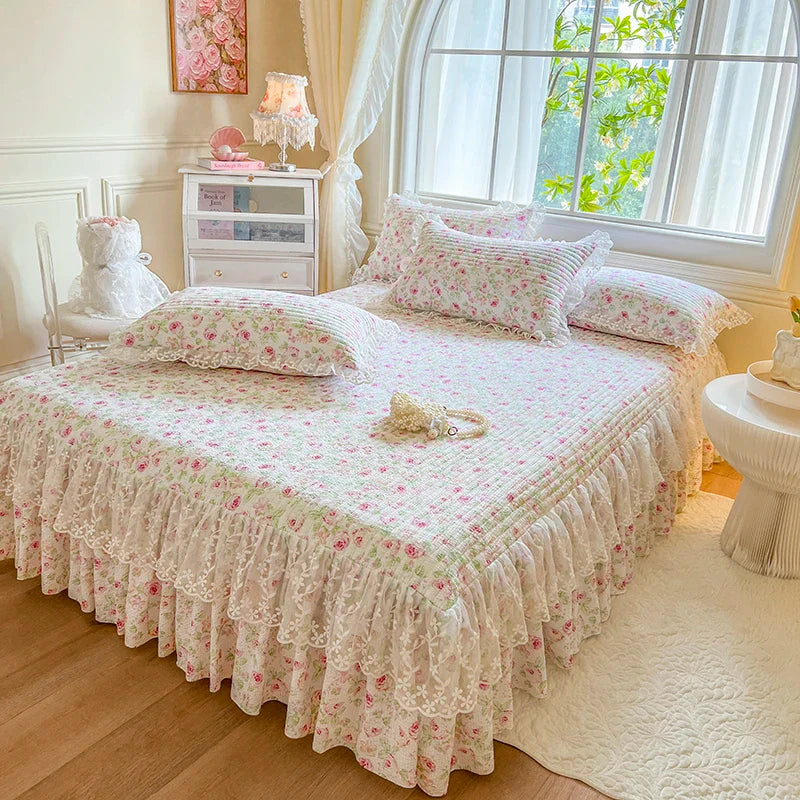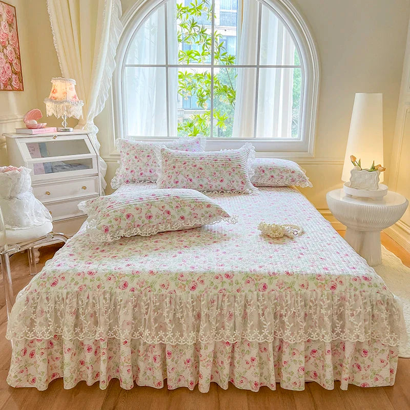 Hooux Princess 1 Piece Lace Bed Skirt + 2 Piece Pillowcases Bedding Bedspreads Sheet Pink Lace Bedding Set Bed For Girl Bed Cover