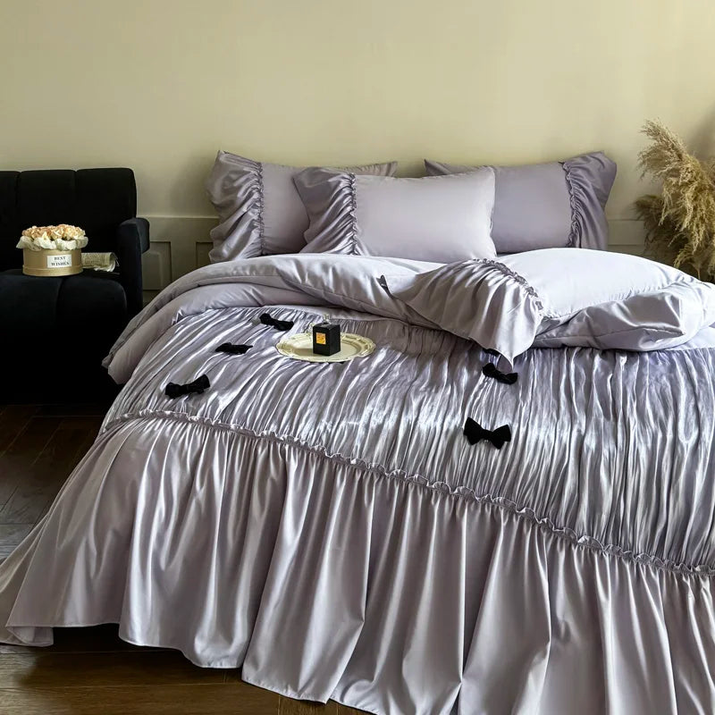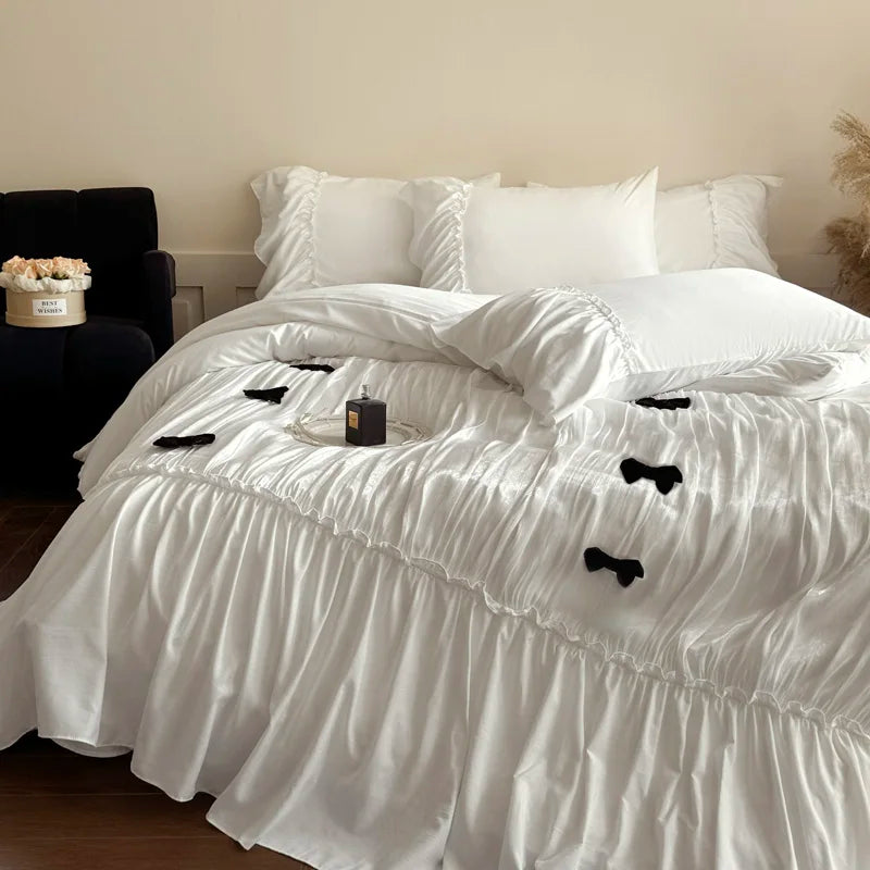 Hooux Vintage French Large Ruffles Black Bow Princess Bedding Set Duvet Cover Set Flat/Fitted Bed Sheet Pillowcases Pillowcases 4Pcs