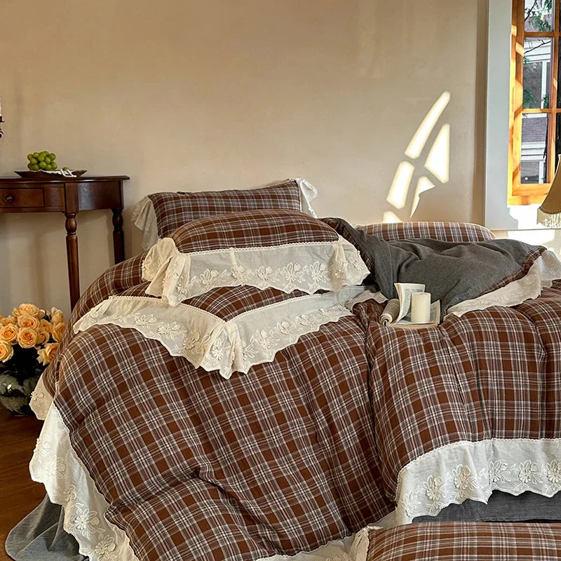 Hooux Vintage Plaid Flowers Lace Ruffles Bedding Set 100% Cotton Double Layer Yarn Duvet Cover Flat/Fitted Bed Sheet Pillowcases 4Pcs