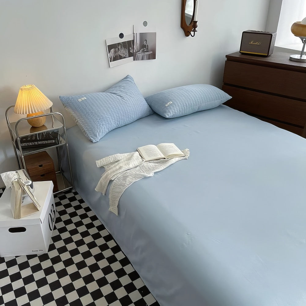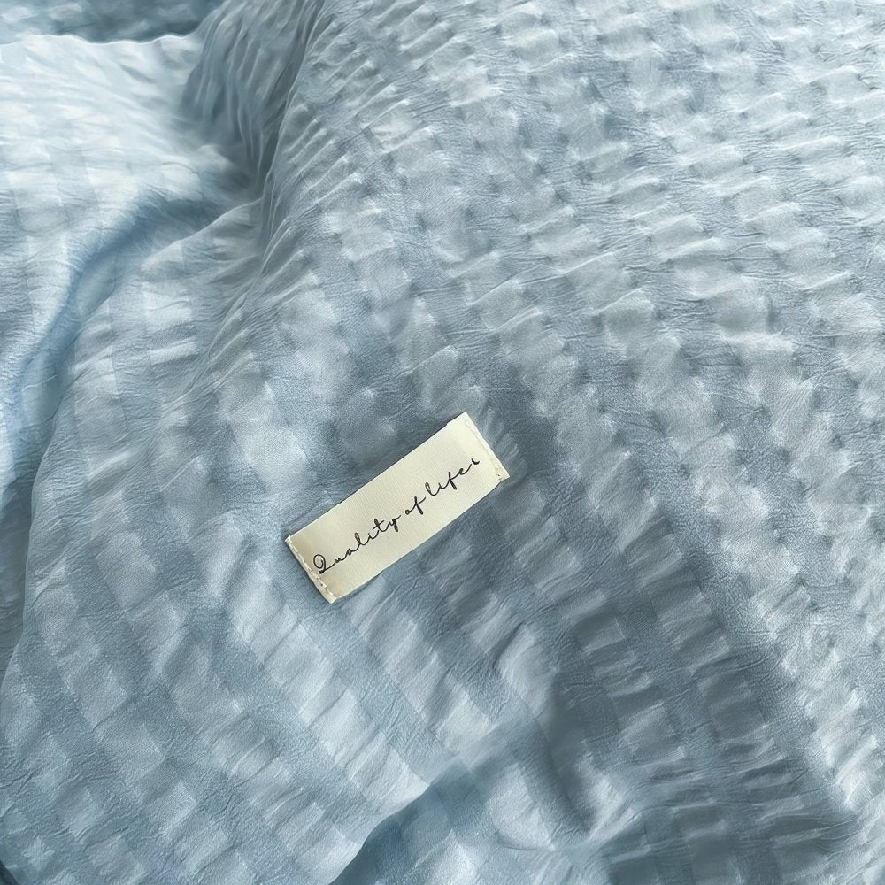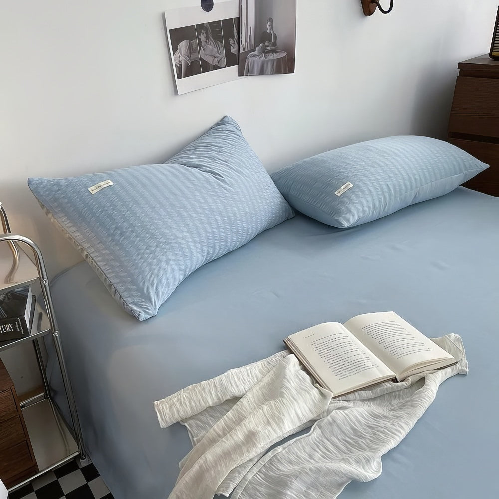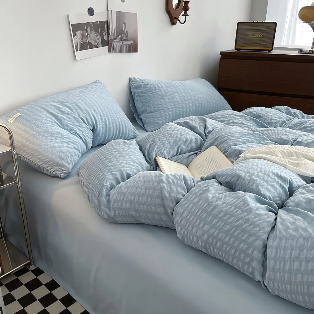 Solid color bedding duvet cover set with waffled stripes pattern all over shams and duvet cover. This one is a perfect addition for girly bedrooms like preppy or dopamine.